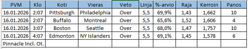 Kaudella 2025 – 2026 NHL-kohteiden vihjemäärä tulee olemaan noin 500 kappaletta painottuen total-vihjeisiin (maalimäärävetoihin) arviolta noin 80% vihjeistä, loput tulevat olemaan vihjeitä Asian Handicap/Money Line -kohteisiin. Panosskaala tulee olemaan kaikissa vetomuodoissa 1-10 panosyksikköä.